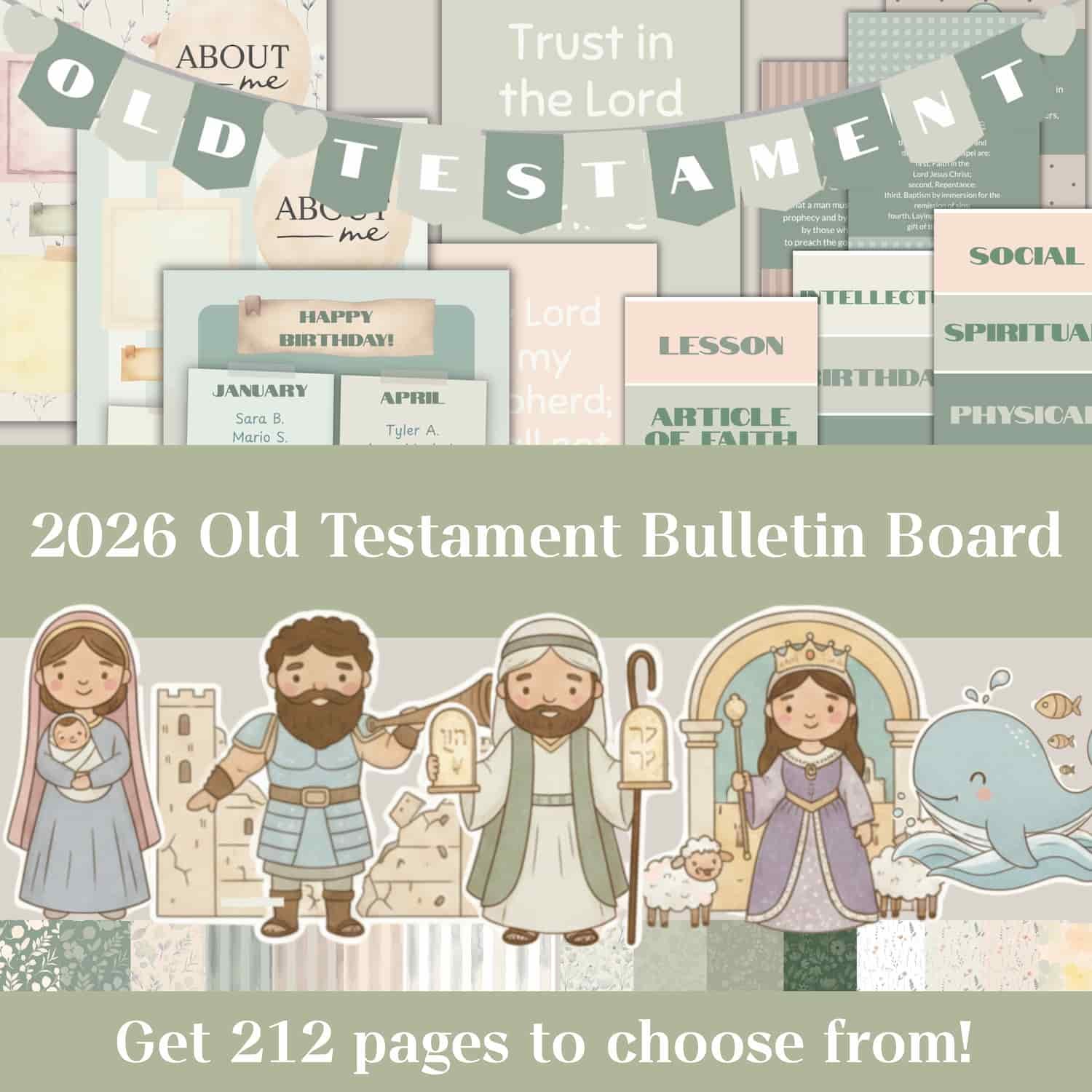 Thie 2026 Old Testament bulletin board pack is perfect for Primary, Sunday School, RS, YW, YM. room or other learning-centered areas. It works great at home as part of your Come Follow Me study.